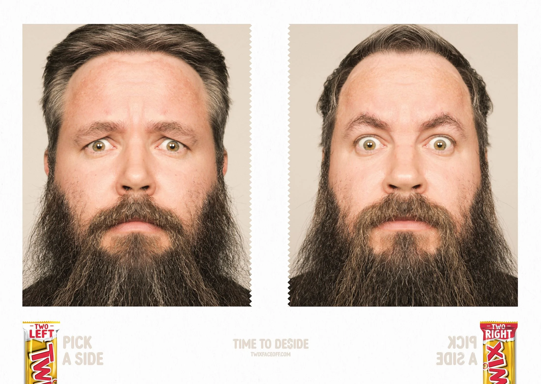 Twix launched a series of print, outdoor and digital ads that illustrated what happens when you apply the Twix duality to someone's face. Then, through a microsite, users could take or upload a selfie and choose their side. More than 10,000 entries in the first week, brand love increased by 97% (internal mars research entity), +11% increase in sales, 86% engagement rate (best ever for a Twix campaign).